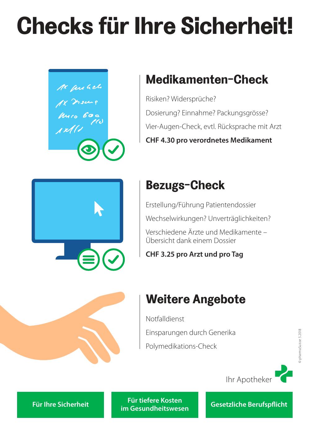 Viele Patientinnen und Patienten erhalten Medikamente von unterschiedlichen Fachpersonen. Im Bezugs-Check führen wir Ihre verschriebenen Arzneimittel in einem Dossier zusammen. So erkennen wir mögliche Unverträglichkeiten oder Wechselwirkungen frühzeitig. Dieser Service wird mit CHF 3.25 pro Arzt und Tag verrechnet – unabhängig davon, wie viele Medikamente Sie erhalten.